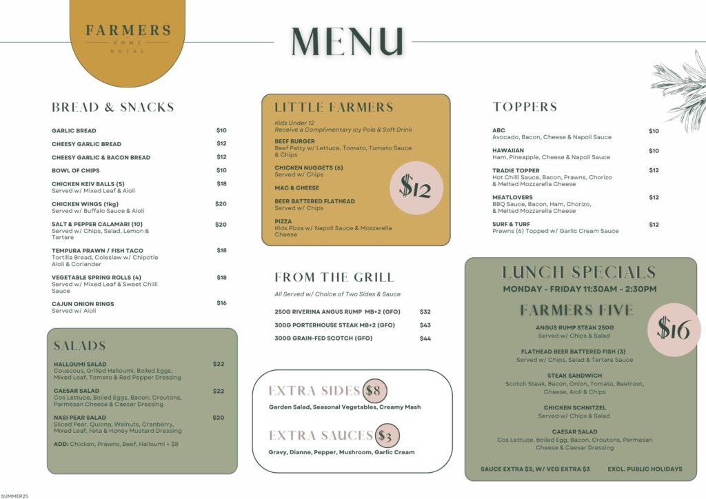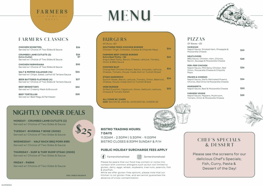 MAIN MENU DOWNLOAD OUR MENU HERE BISTRO 7 DAYS LUNCH: 11:30am – 2:30pmDINNER: 5:30pm – 9pm (8.30PM SUN + P/H) Takeaway $3 per meal | 10% surcharge applies on Public Holidays